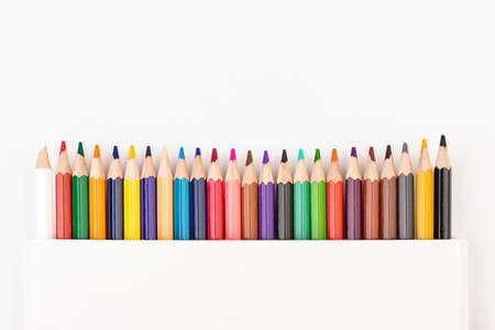 Color pencils set, row wooden color pencils isolated on white background. colored pencils for drawing. copy space.
