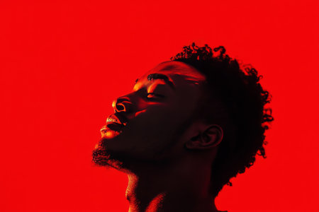 A person is captured in a creative portrait showcasing their unique facial features illuminated by bold red and blue lighting.