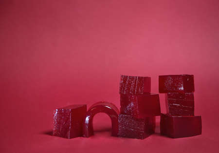 marmalade is stylishly laid out on a red background. Banner for a pastry shop and coffee shop. With space for text. abstract background, a city made of marmalade. stylish, non-standard advertising