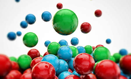 Abstract 3d rendering of chaotic multicolored spheres. Bokeh background.