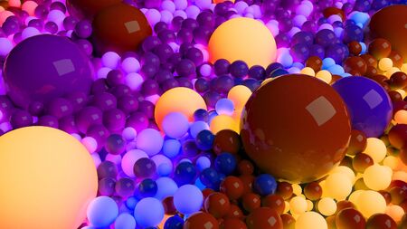beautiful shiny balls of different colors and sizes completely cover the surface. Some spheres glow. 3d photorealistic render geometric reative holiday background of shiny balls.