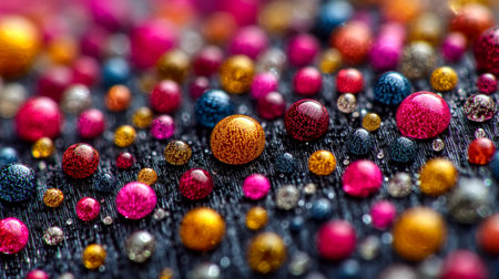 Brightly shimmering beads with tiny droplet accents scatter across a deep, velvety fabric, creating a luxurious and vibrant opulence scene.