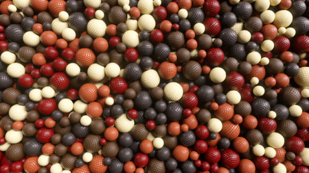 A close-up of a field of colorful, round balls with a variety of textures. The depth of field makes the balls in the background out of focus, creating an abstract composition.