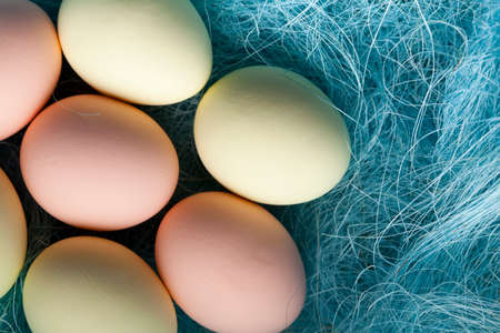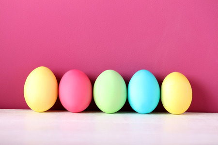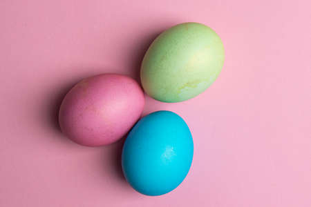 Easter colorful eggs pink, blue, green and white. Easter celebration concept.