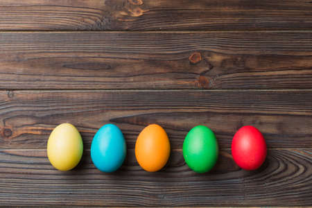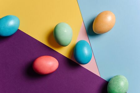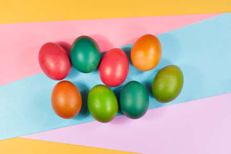 holiday preparation Multi colors Easter eggs on colored background . Pastel color Easter eggs. holiday concept with copy space.