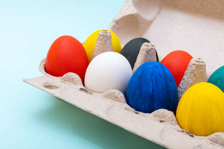Easter eggs are the color of the rainbow. Blue background. Cardboard eco packaging