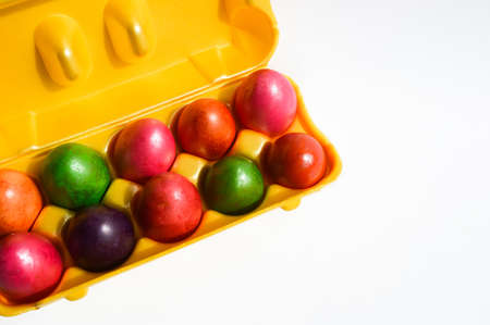 multicolored chicken eggs in a yellow box on a white background. Easter.