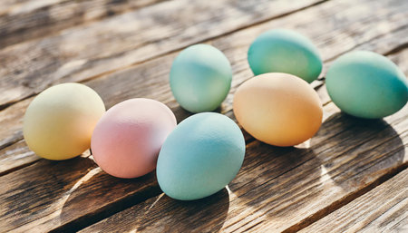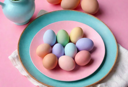 A collection of beautifully colored eggs arranged in a carton, featuring soft pastel shades of blue, pink, and green. Ideal for seasonal themes.