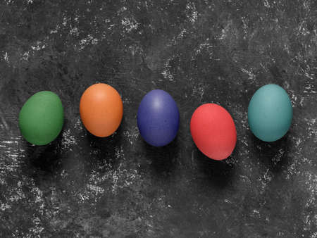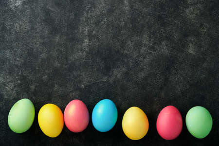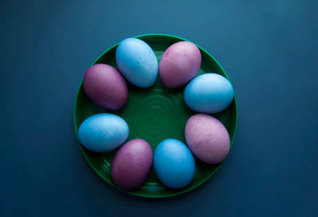 Colored chicken eggs on a dark blue background. Easter concept. Minimalism. Top view. Copy space