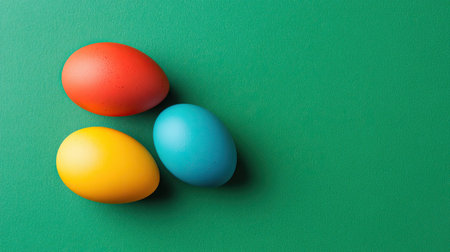 A vibrant arrangement of three colorful Easter eggs in red, yellow, and blue, set against a green background, ideal for spring-themed decorations or celebrations.