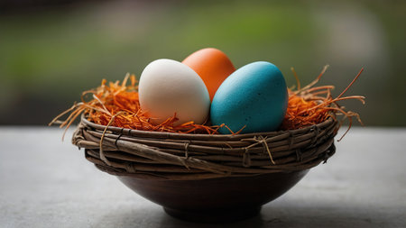 This stunning image features a variety of decorative eggs arranged in a woven basket, showcasing pastel colors and speckled designs, perfect for spring or Easter themes.