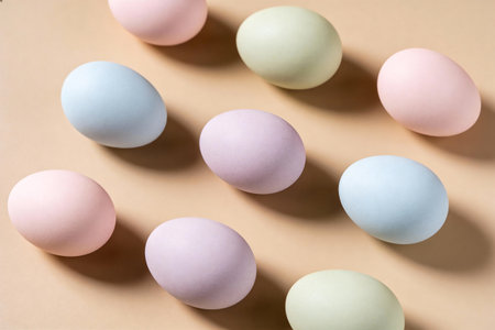 A collection of delicately colored Easter eggs, featuring soft pink, blue, and green hues, artfully scattered across a smooth, neutral surface