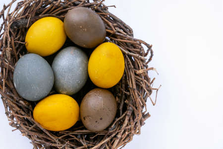 Multicolored Easter eggs in a bird's nest isolated on white background. Top view. Copy space