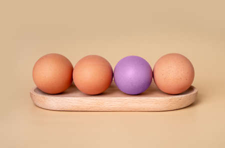 Outstanding violet Easter egg among natural at wooden server on beige background. Religious holiday tradition or individuality, standing out from crowd concept. High quality photo