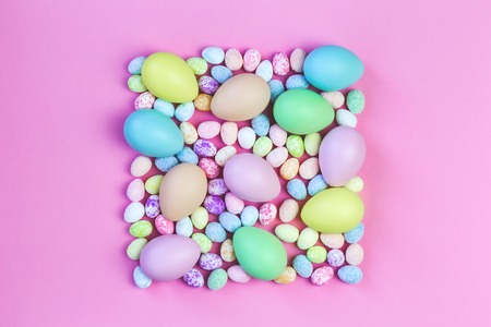 Square shaped Colorful Assorted sizes Pastel Eggs. Happy Easter card flat lay on bright pink festive background