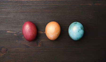 Easter eggs. Dyed Easter eggs with marble stone effect ref and blue color in rustic style on dark stone background. Easter background. top view.