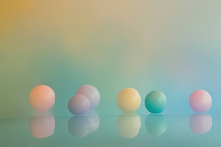 Soft pastel colored spheres reflecting on a smooth surface, creating a calm and serene ambiance, perfect for wellness and mindfulness concepts