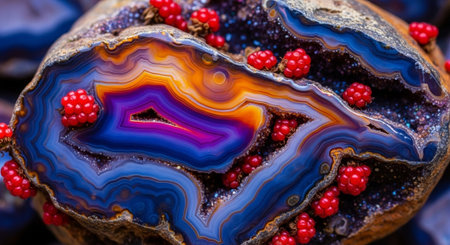 Beautiful colorful agate slice showcasing natural mineral patterns and sparkling druzy crystals