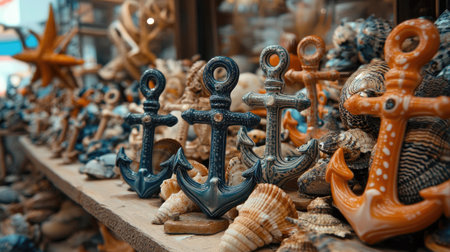 A collection of colorful ceramic anchors displayed on a rustic table among seashells, showcasing fine craftsmanship in a coastal shop ambiance.