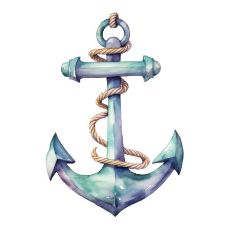 A close-up captures a weathered wooden anchor, painted in blue and red tones, accompanied by a coiled rope. The composition highlights textures and materials, possibly suggesting a maritime theme. This image may be suitable for illustrating concepts of seafaring, travel, or decoration, finding applications in various commercial and creative projects.