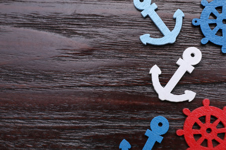 Anchor and ship wheel figures on dark wooden table, flat lay. Space for text