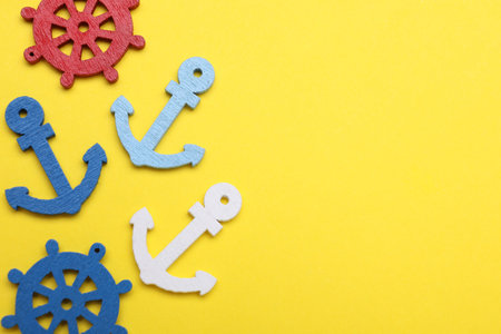Anchor and ship wheel figures on yellow background, flat lay. Space for text