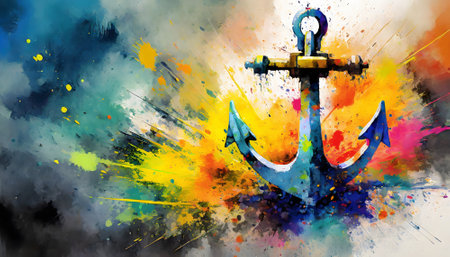 Security theme showing an anchor in multicolored vibrant splashy ambiance. AI generated image with lots of paint splashes, splatters and spots