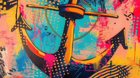 An abstract, colorful painting featuring a bold anchor surrounded by arrows and splattered paint against a textured backdrop.