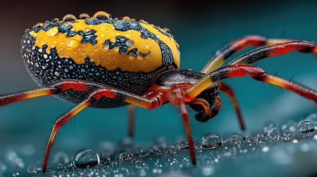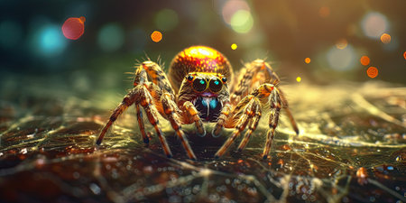 This vivid close-up image captures a spider in rich detail, showcasing its vibrant colors and intricate features against an artistic background.