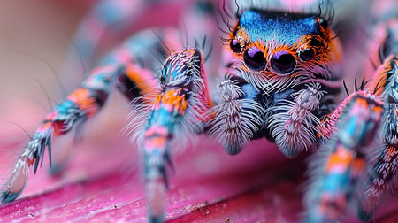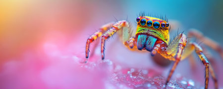 A close-up image showcases a brightly colored jumping spider. The subject displays vibrant shades of pink, blue, and orange, set against a dark backdrop. The composition highlights the spider's intricate details. Suitable for various creative and commercial applications, this image offers a visually striking design element.