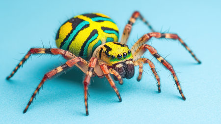 This striking image features a colorful spider showcasing bright patterns on a light blue background. Perfect for nature enthusiasts and photographers.