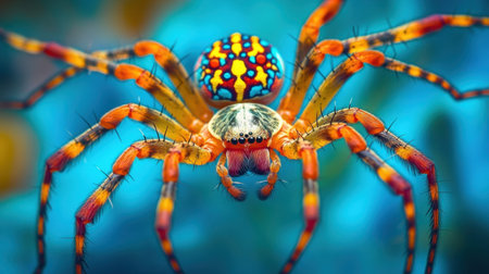 A striking close-up image of a vibrant spider showcasing its colorful patterns against a blue background. This captivating photograph highlights the intricate details of the creature, making it an excellent choice for nature enthusiasts and wildlife photographers.