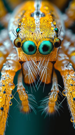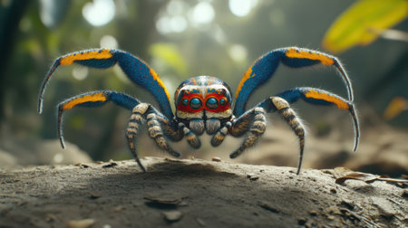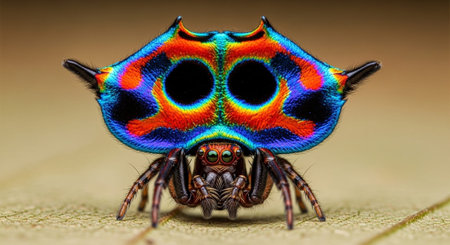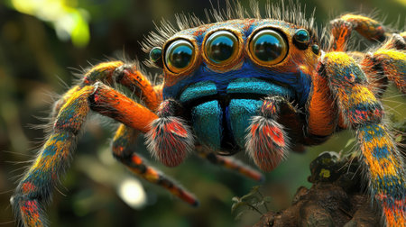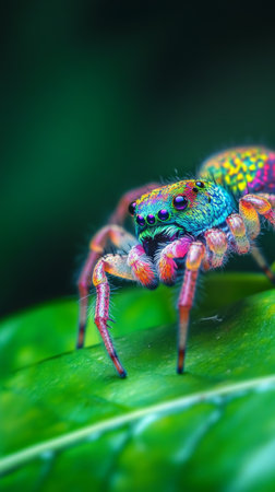 A mesmerizing close-up of a colorful spider showcasing intricate details of its eyes and body. The vibrant colors capture the essence of natural beauty.