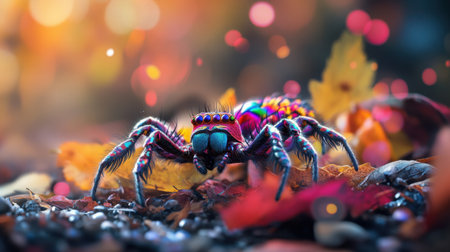 A stunning macro image of a colorful spider perched on fall leaves, showcasing vibrant hues against a soft bokeh background, capturing nature's beauty.