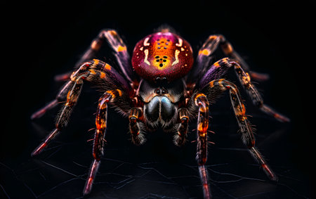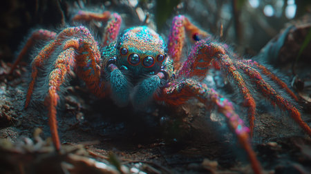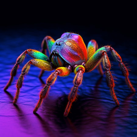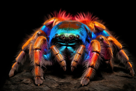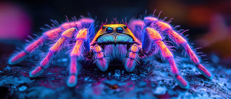 Brightly colored neon tarantula, glowing in dark, vivid and mesmerizing, closeup