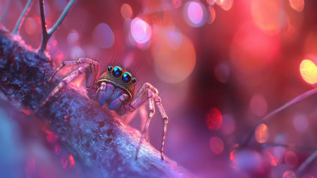 A stunning close-up of a spider perched on a branch, surrounded by a sparkling bokeh background of vibrant purple and pink, showcasing intricate details and colors.