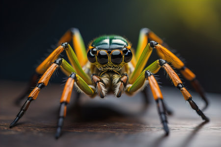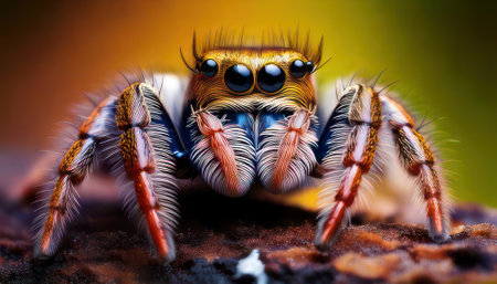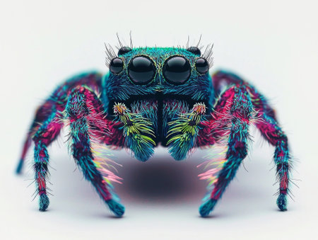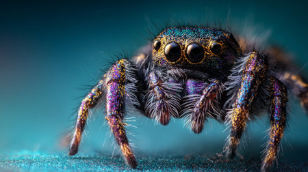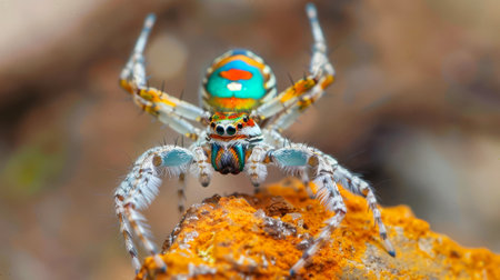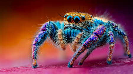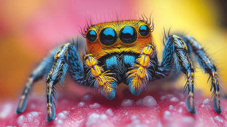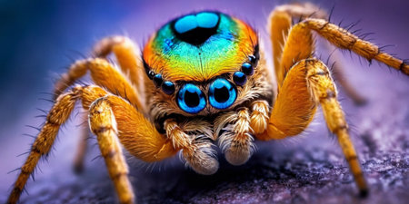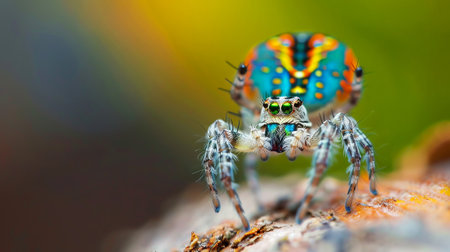 Vibrant close-up of colorful jumping spider on blurred background, macro nature photography concept