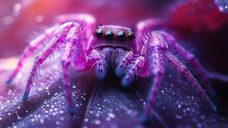 Close-up of a vibrant purple jumping spider with detailed fur and dewdrops, macro photography concept