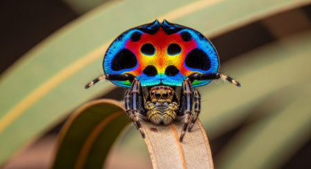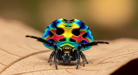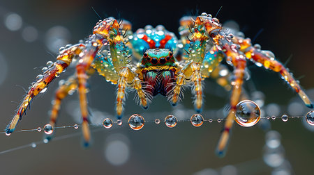 This captivating close-up showcases a spider in brilliant colors and intricate details, highlighting the beauty of nature's small creatures.