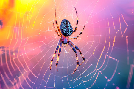 A spider rests in the center of a vibrant, multicolored web against a dark backdrop. The image showcases intricate details of the arachnid and its silken structure. The vivid color palette and precise composition are suitable for various applications, including editorial and advertising projects.