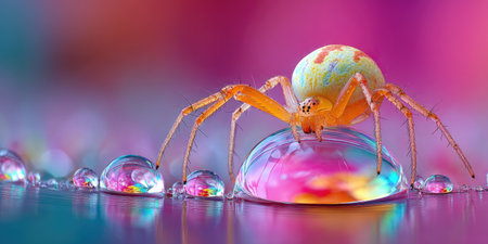 A detailed macro photograph features a spider positioned on a rippled water surface. The creature is the central focus with its delicate legs. The backdrop is a gradient of colors including pink, green, yellow and purple providing an artistic background. Suitable for illustrative or conceptual uses in multiple contexts.