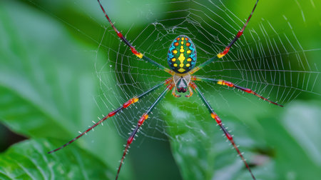 A stunning close-up of a colorful spider on its intricate web, set against lush green leaves, showcasing vivid colors and detailed patterns in nature's beauty.