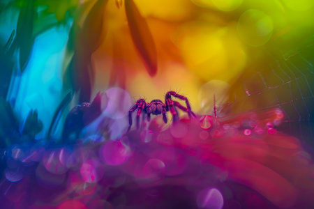 A close-up view presents a jumping spider against a vibrant, rainbow-colored background. The spider displays detailed textures and is depicted with a focus on its form. The scene's composition, use of vivid colors, and potential water droplets suggest a natural outdoor setting, suitable for various editorial and commercial applications.