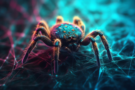 Vibrant spider on a glowing web, detailed closeup with neon hues of pink, blue, and orange, dark background
