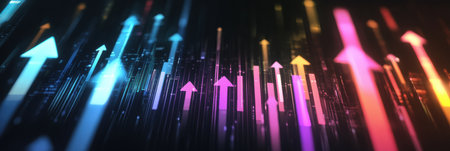 Bright arrows in various colors rise against a dark background, symbolizing growth and progress in a futuristic digital environment.