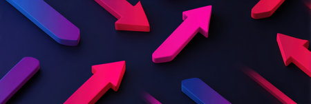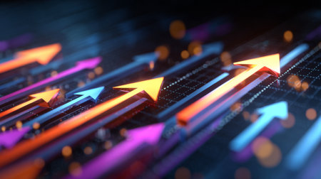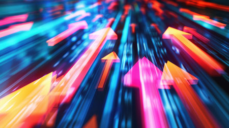 Captivating abstract image of colorful arrows symbolizing growth and progress in a dynamic digital space featuring vivid lighting and depth effects, ideal for business themes.