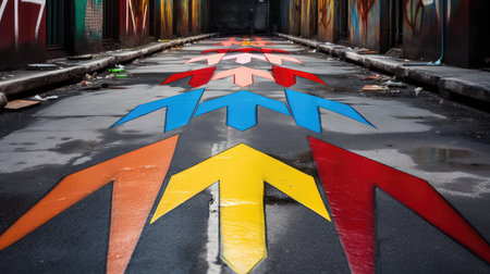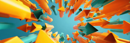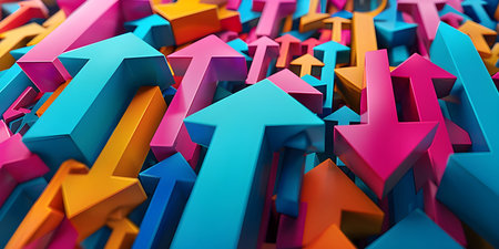 Vibrant arrangement of colorful arrows in various orientations creates a dynamic visual. This image represents progress and direction, ideal for expressive projects.