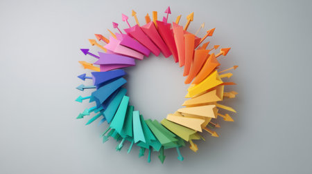 A stunning arrangement of paper arrows in various colors forms a dynamic circle, perfect for creative projects, presentations, or decoration solutions.