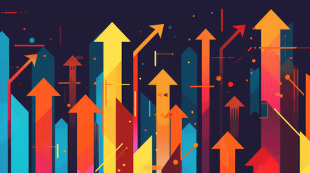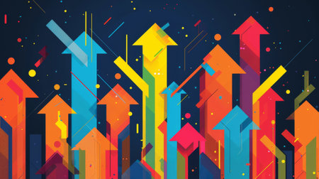 Vibrant abstract background with colorful arrows pointing upward, symbolizing growth and success, complemented by geometric patterns and icons representing data and innovation.