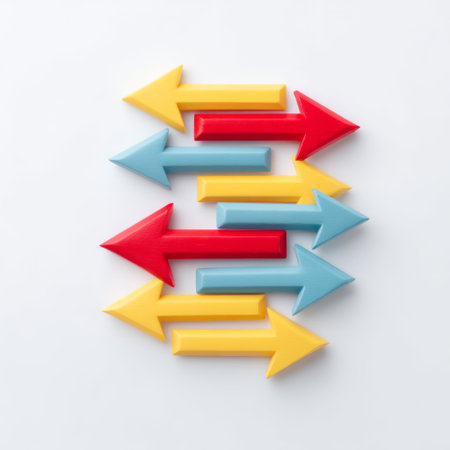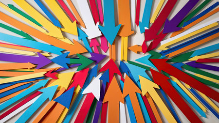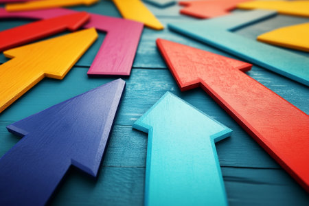This image features a set of colorful arrows arranged in various directions against a bright background. Perfect for illustrating ideas of movement, strategy, or change in creative projects.
